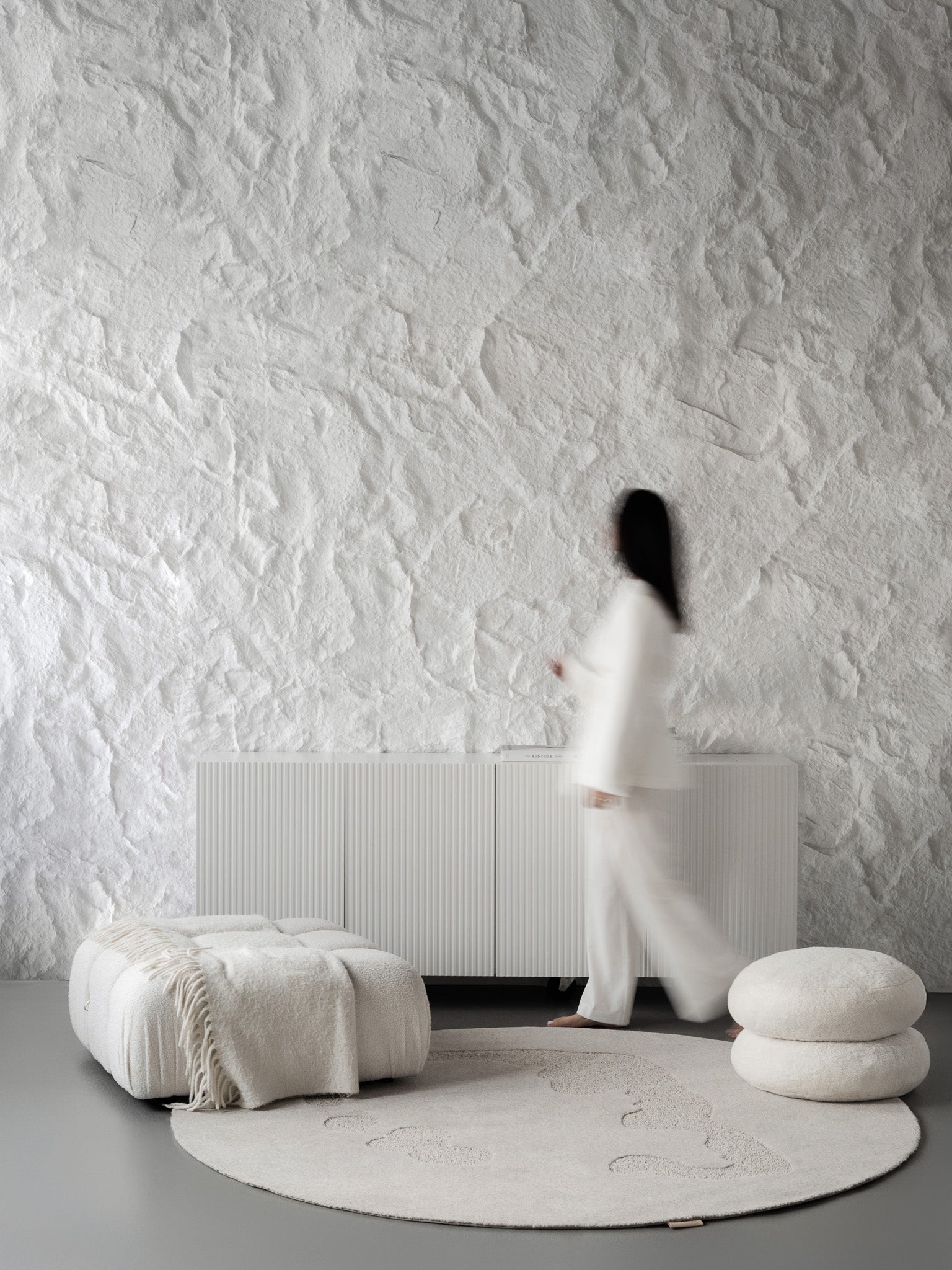 To, co najbardziej wyróżnia kolekcję Morphic, to jej trójwymiarowa struktura. Łącząc wysokie runo z pętlami bouclé, uzyskaliśmy powierzchnię, która reaguje na światło – zmienia się w zależności od kąta jego padania, tworząc subtelną grę cieni i refleksów. Ten efekt sprawia, że dywany z tej kolekcji stają się żywym elementem przestrzeni – dynamicznym, wyrafinowanym i nieoczywistym.